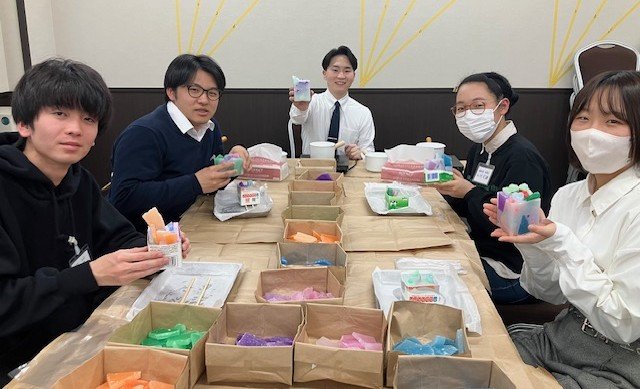 キャンドルワークショップで使用したキャンドルは、通夜・葬儀で使用したロウソクを再利用したものです。お祈りの場面では数種類のロウソクを使用しますが、そのほとんどが使い切ることが難しく、使用済みのロウソクがたくさん残ってしまいます。そこで会館から回収した使用済みのロウソクを一度溶かし、ススなどの汚れを取り除いたうえで、染料を加え、カラフルなキャンドルとして生まれ変わらせています。このキャンドルワークショップは、会館でのイベントや児童館などの外部施設においても開催しています。当日は、自宅から飾りを持参してくれた内定者もおり、それぞれの個性あふれるキャンドルが完成しました。参加した内定者からは「通夜や葬儀ではもう使えないロウソクを、リサイクルしているのがとても素敵だと思った」「使いかけのロウソクが可愛いキャンドルになって、素敵な取り組みだと思った。みんなでワイワイ作るのも楽しかった」といった感想が寄せられました。