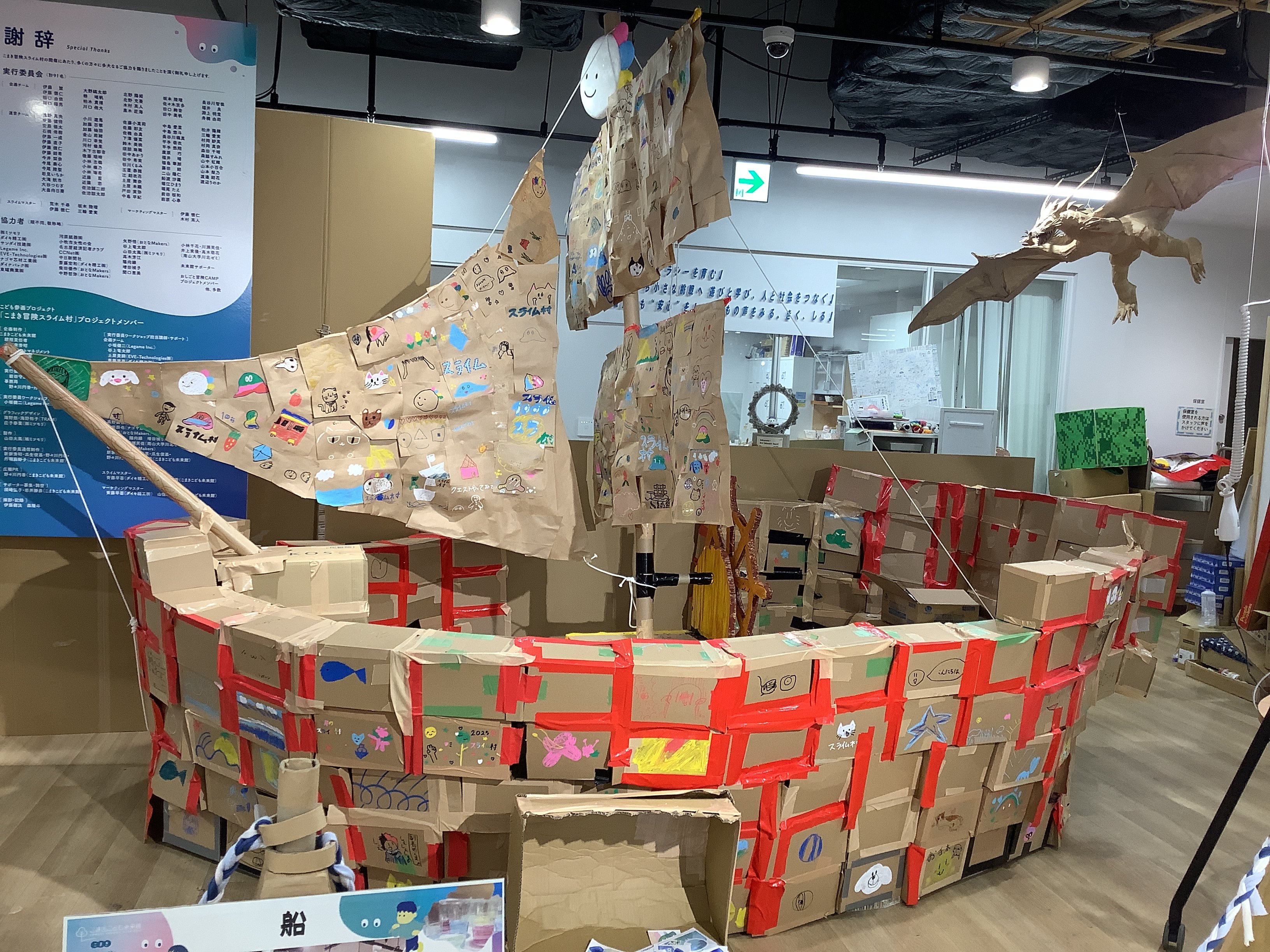 資材をお渡しして数か月経った頃、「子どもたちがとても素敵な作品を作ってくれた!」と、こまきこども未来館の方からご連絡をいただきました。こまきこども未来館では、2025年7月24日~8月9日に「こまき冒険スライムむら」というイベントを開催されており、そのイベントに参加された子どもたちが、ティアから提供した資材を使って「大きな船」を作ってくれたのです!段ボールをテープで貼って船を作り、帆の部分には古紙を使用して、個性あふれる絵も描いてくれました。廃棄するしかないと思っていた資材を、こんなにも素敵な作品に生まれ変わらせてくれた子どもたちに心から感謝しています。また、大量の資材を快く引き取ってくださったこまきこども未来館の皆さま、本当にありがとうございました。