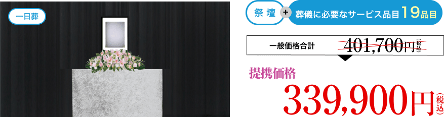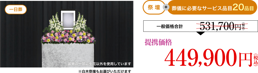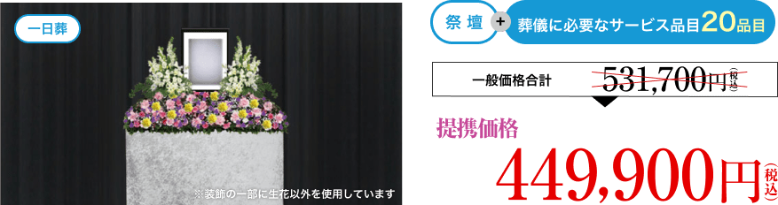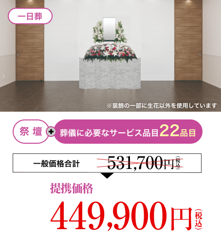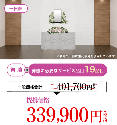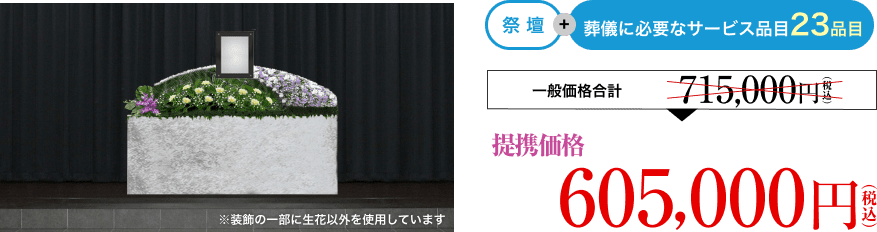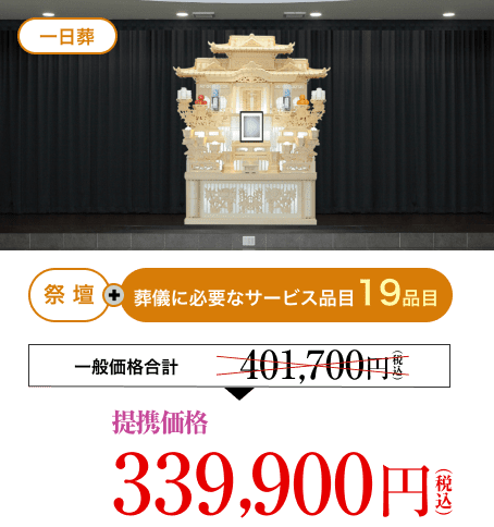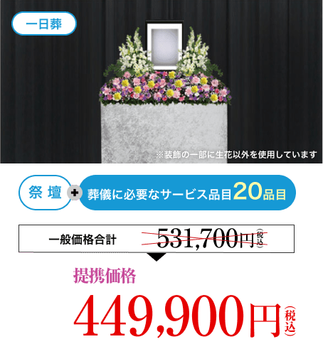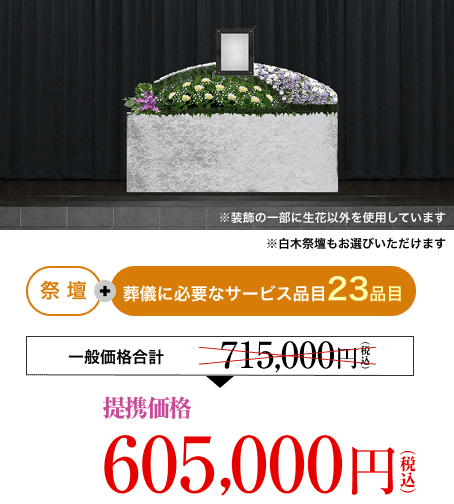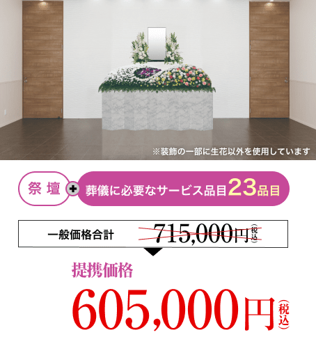 ※表示価格は全て税込表示です。※掲載されている価格は予告なしに変更される場合がございます。※サービス料とは、通夜・葬儀等のアシスタントや警備員等の人件費です。参列者の人数に応じて別途費用がかかる場合がございます。※その他、サービス企画との併用はできません。※祭壇セットプランに含まれる品物やサービスをご利用いただかない場合でも、プランの値引きは行っておりません。※安置料は当社施設でお預かりする場合となります 。当社以外の施設でのご安置は追加料金が必要となります。※写真はイメージです。お選びいただくプランによって各品目の仕様が異なります。※一部の会館では記載のプランを取り扱っておりません。※他にも宗派・予算に合わせて祭壇セットを各種ご用意しております。詳しくは係員にご相談ください。
