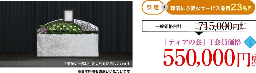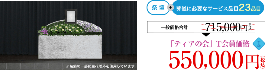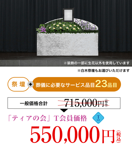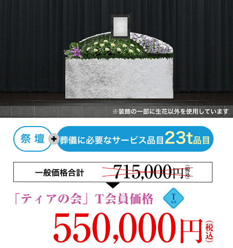 ※表示価格は全て税込表示です。※掲載されている価格は予告なしに変更される場合がございます。※サービス料とは、通夜・葬儀等のアシスタントや警備員等の人件費です。参列者の人数に応じて別途費用がかかる場合がございます。※その他、サービス企画との併用はできません。※祭壇セットプランに含まれる品物やサービスをご利用いただかない場合でも、プランの値引きは行っておりません。※安置料は当社施設でお預かりする場合となります 。当社以外の施設でのご安置は追加料金が必要となります。※写真はイメージです。お選びいただくプランによって各品目の仕様が異なります。※一部の会館では記載のプランを取り扱っておりません。※他にも宗派・予算に合わせて祭壇セットを各種ご用意しております。詳しくは係員にご相談ください。